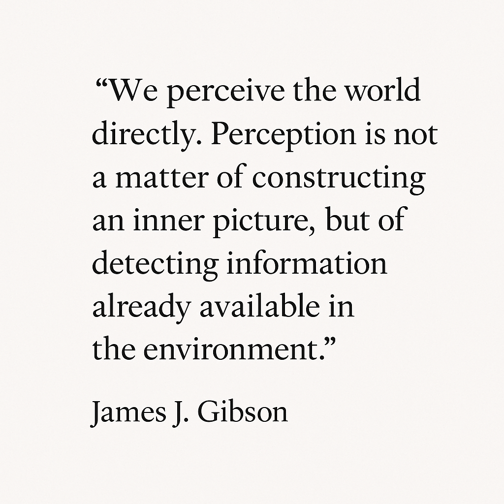 In the mid-20th century, psychologist James J. Gibson disrupted the dominant paradigm of perception. At the time, most theories assumed that perception was an indirect process: the eyes captured a chaotic array of light, which the brain then interpreted and reconstructed into something meaningful.